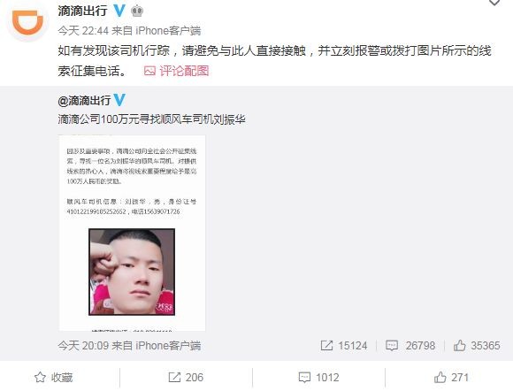 5月10日晚上8点,@滴滴出行 微博发布悬赏100万寻找顺风车司机刘振华!