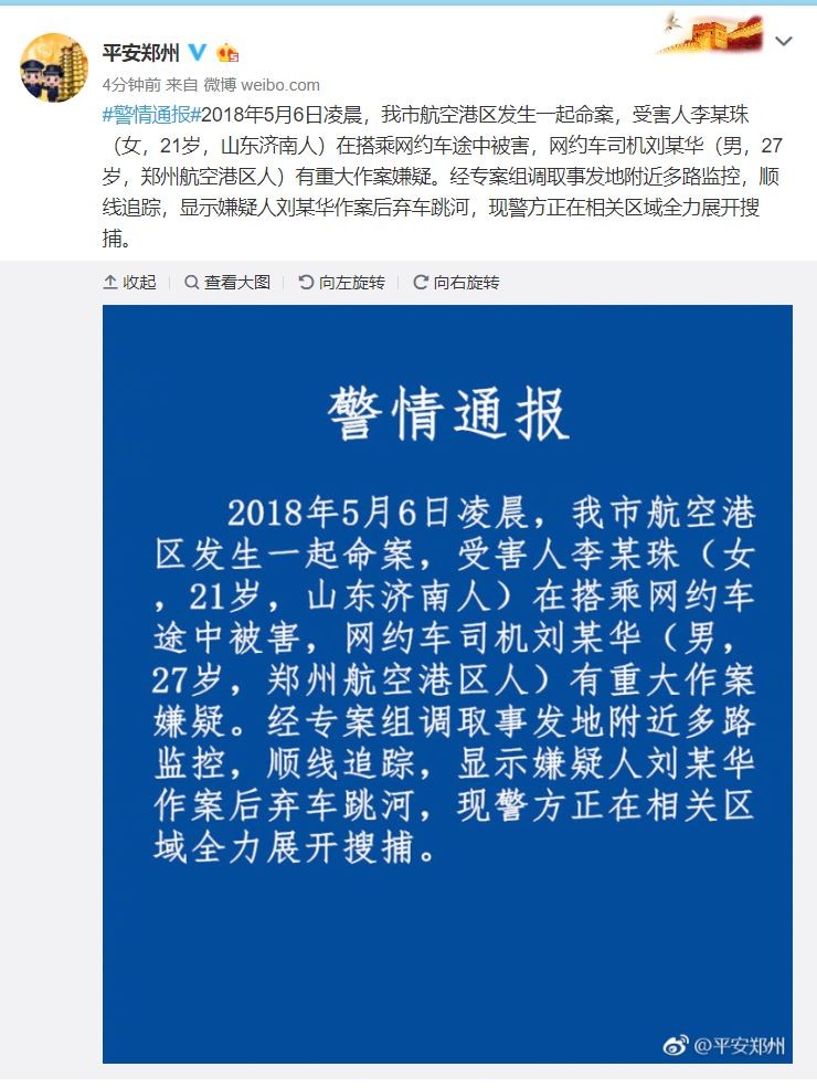 5月6日,一名空姐在郑州市航空港区搭乘一辆轿车赶往市内时遇害。嫌疑人是一名滴滴司机,身上携凶器,作案后潜逃。