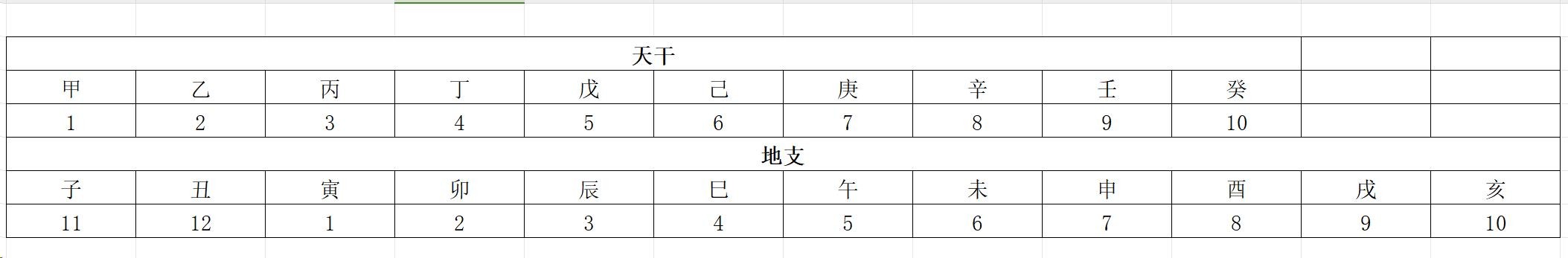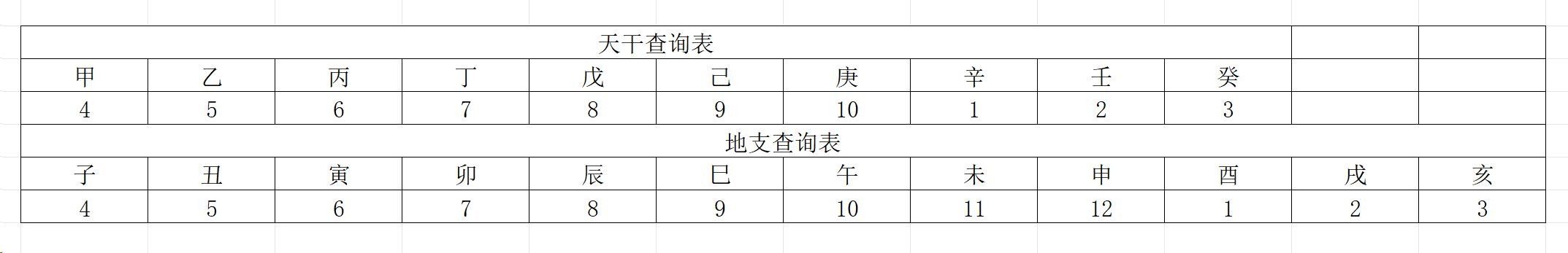 将年份数的个位数对应天干查询表得出天干。将所求的年份数除以12,所得的余数即为对应的地支。出现个位数为0的年份,天干即规定为10,地支的序码数即用已知年份除以12。能被12整除的年份,天干由已知年份的个位数可查,地支则规定为12。能被12整除且个位数为0的年份,天干对应序码10,地支对应序码12。