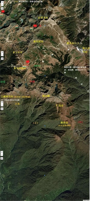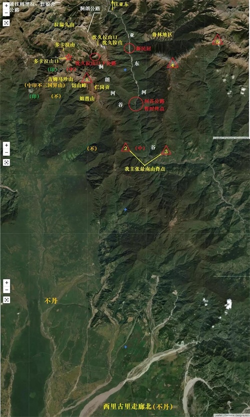 洞朗地区,从最北的拉恩久山—>沿山脊南下至拉温久山口—>多卡拉山—>到最西吉姆马珍雪山—>切山峰—>仁岗贡—>姐普山—>我主张最南山脊2,和亚东河东岸山脊5—>4—>我主张最南山脊3之间的河谷,山口。