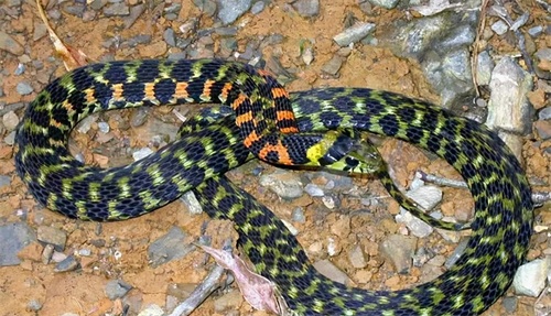 虎斑颈槽蛇(虎斑游蛇),游蛇科,颈槽蛇属。俗称为野鸡脖子等。由于虎斑颈槽蛇的特殊习性,常出没于农村粪圏厕所,也被人们认为是蛇类中比较不卫生的一种。