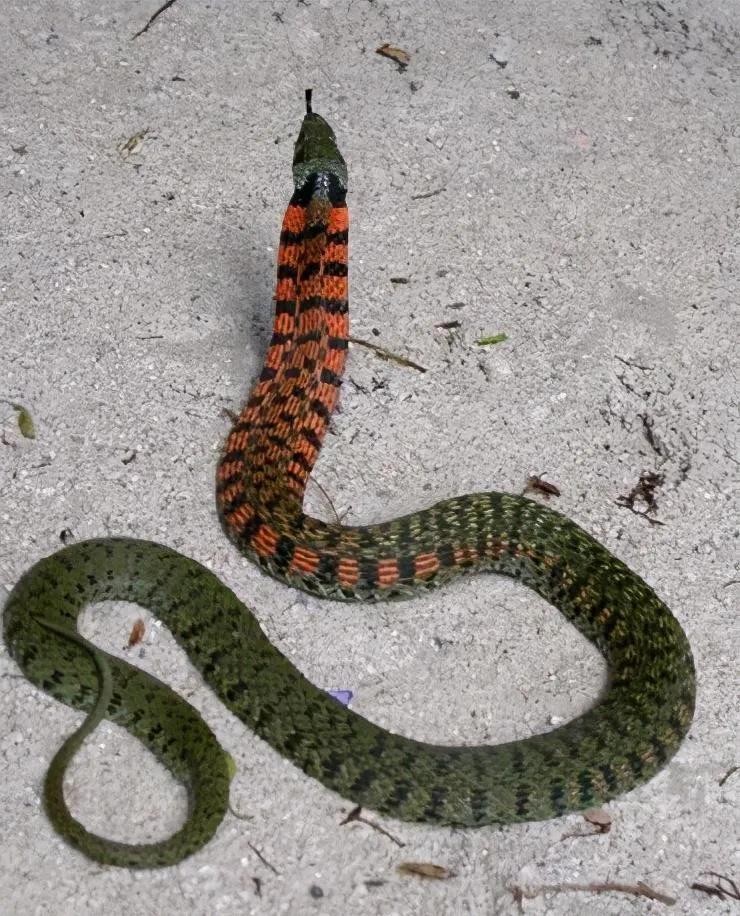 体背面翠绿色或草绿色,体前段两侧有粗大的黑色与桔红色斑块相间排列,枕部两侧有一对粗大的黑色“八”形斑。虎斑颈槽蛇是我国学术界广泛争议的一种蛇类,由于性格温顺,很多学者都认为它是无毒性的蛇类。其实它是毒蛇(过敏体质有中毒死亡先例,在日本被归为毒蛇)但性格温顺。