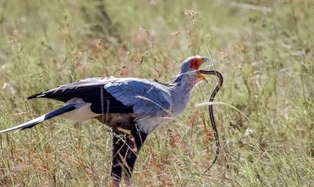 如果遇到体型巨大的蛇,蛇鹫便会直接叼起蛇飞向天空,在高空中松开嘴,让蛇坠落,然后再回到地面享受美味。