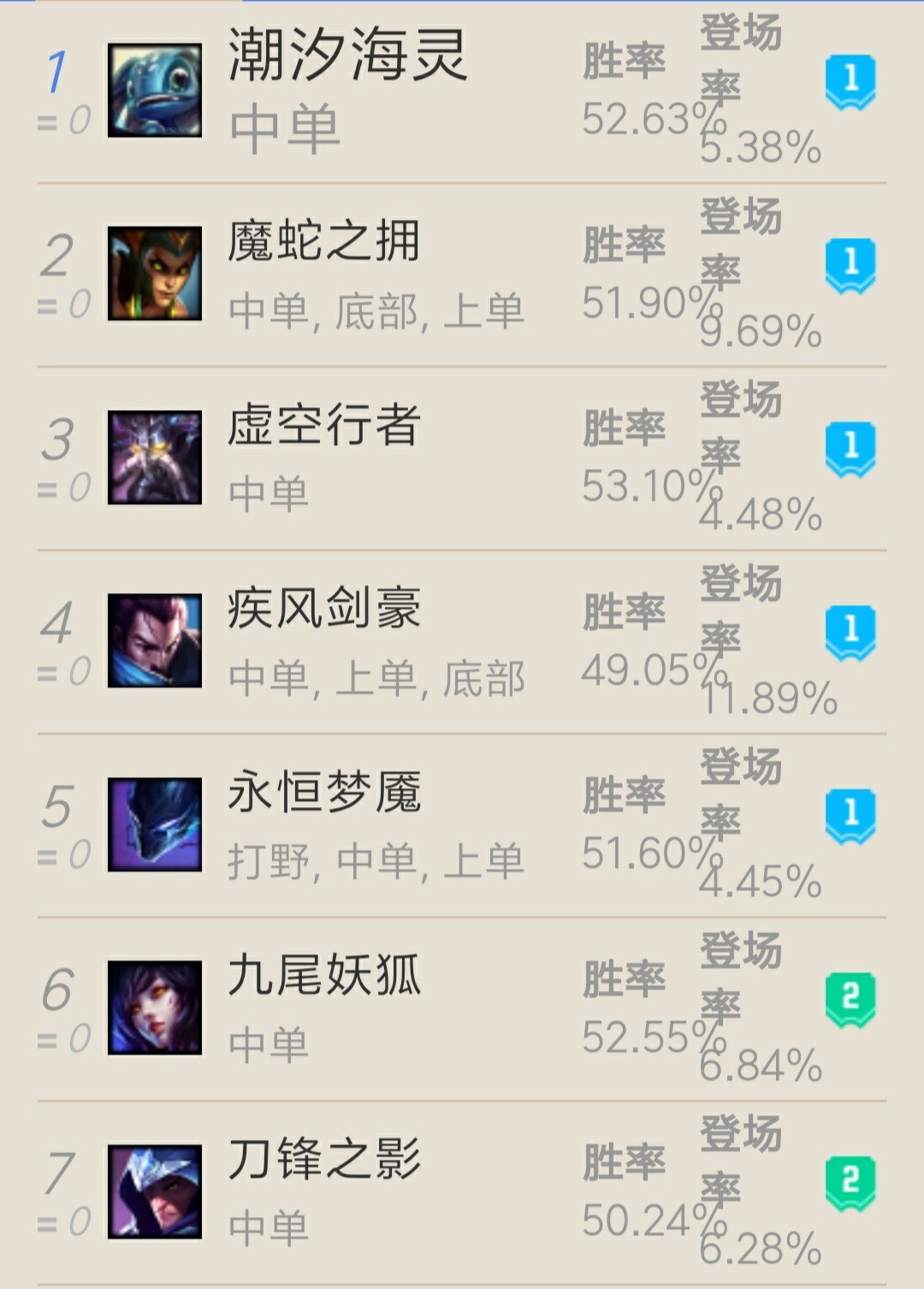 小鱼人、梦魇、狐狸、男刀,重回前十。新版本征服者带来的高额吸血可以为他们增加更强的持续作战能力,增强他们的生存能力。