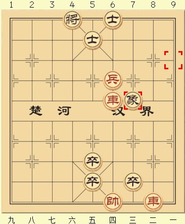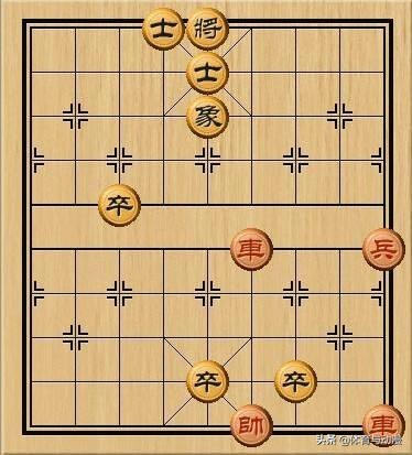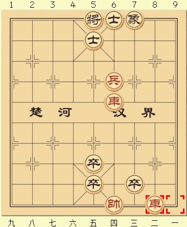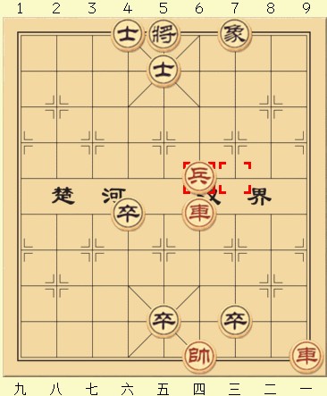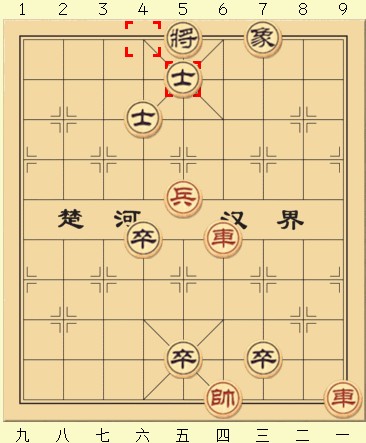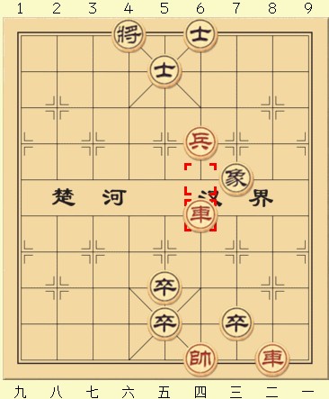 可以看到若红方在黑象前进后仍然选择按兵不动,那黑方就赢了,由于黑象出其不意地阻挡到了红车的绝杀路线,所以黑方以一步的优势获胜。所以到这种局面红方只有一种走法——进兵。首先兵五进一,此时黑方即使再平卒也已经跟不上了,所以只能进士吃兵。而红车不能离开纵四,所以红方也只能进车吃士,这时若黑方起士,那这盘棋就变成了和局,此时无论红方怎么将也将不死黑方。