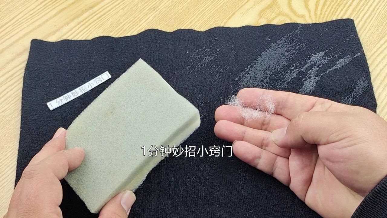 第四个方法,我们也可以把家里面的百洁布给找出来。最好是找干燥的或者是没用过的百洁布,效果会更好。我们把百洁布粘上一点点水,然后再往衣服有毛的地方刷几遍,这些毛就会被刷下来了。如果刷不下来的话它也会被刷成团,我们直接把这些成团的毛发给丢掉就可以了。