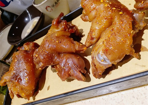 特别推荐嫩烤颈背肉,肉质超嫩。而且调味做的特别好。口感香甜,滑嫩好吃。还有桌桌必点的铁板掌中宝,艮啾啾的口感,里面的汤汁完全被鸡爪吸收,吃着也特别过瘾。