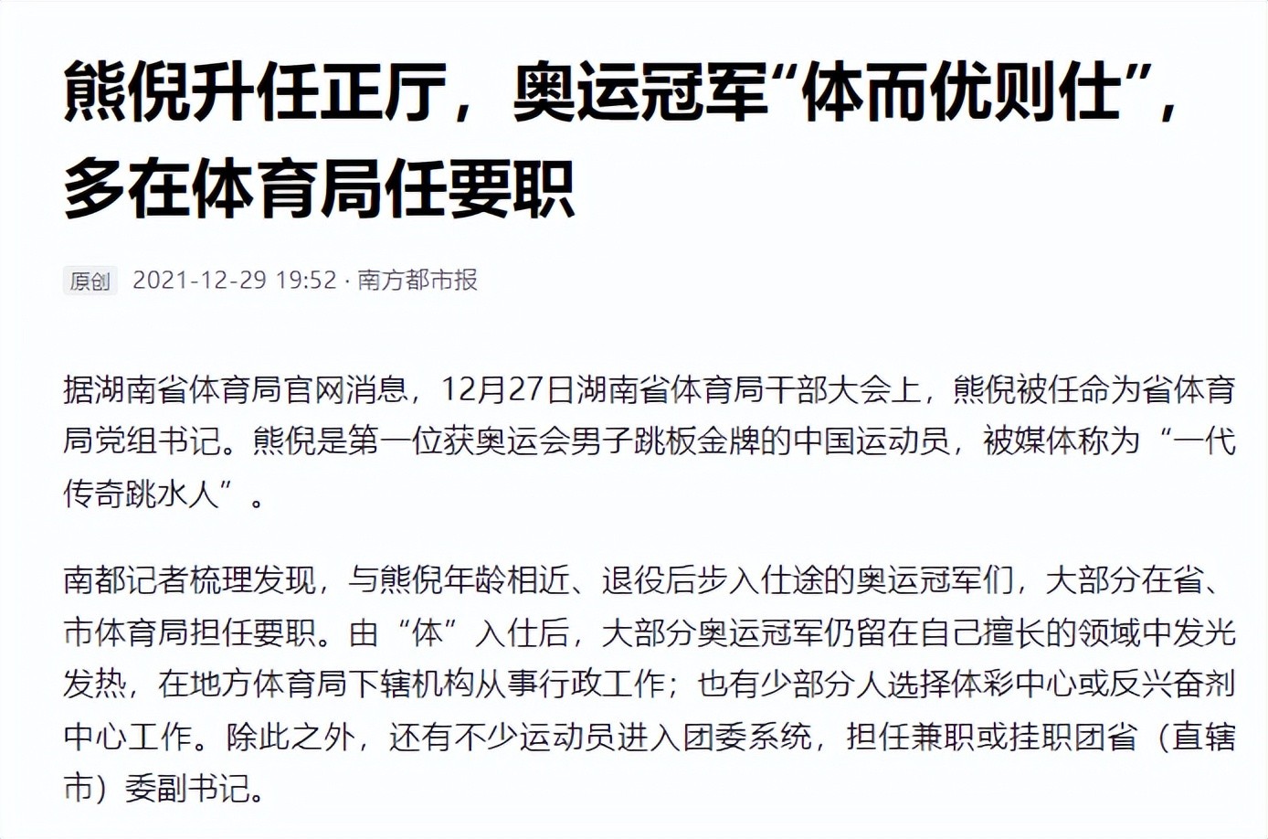 南方都市报在2021年12月29日关于《熊倪升任正厅,奥运冠军“体而优则仕”,多在体育局任要职》的报道