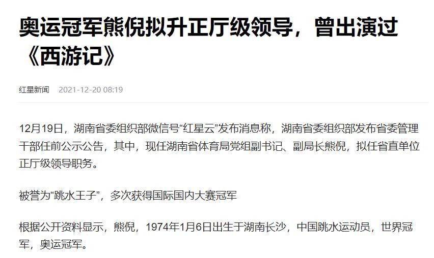 红星新闻在2021年12月20日关于《奥运冠军熊倪拟升正厅级领导,曾出演过《西游记》》的报道