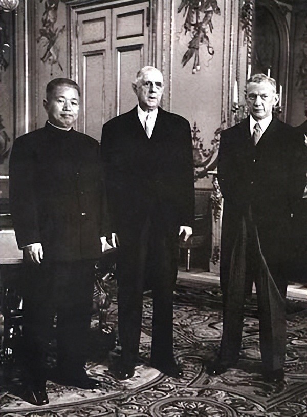 中国首任驻法大使黄镇(左)、戴高乐(中)