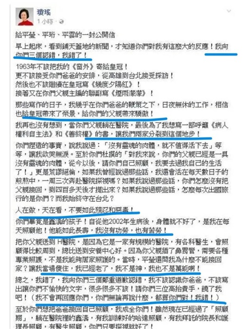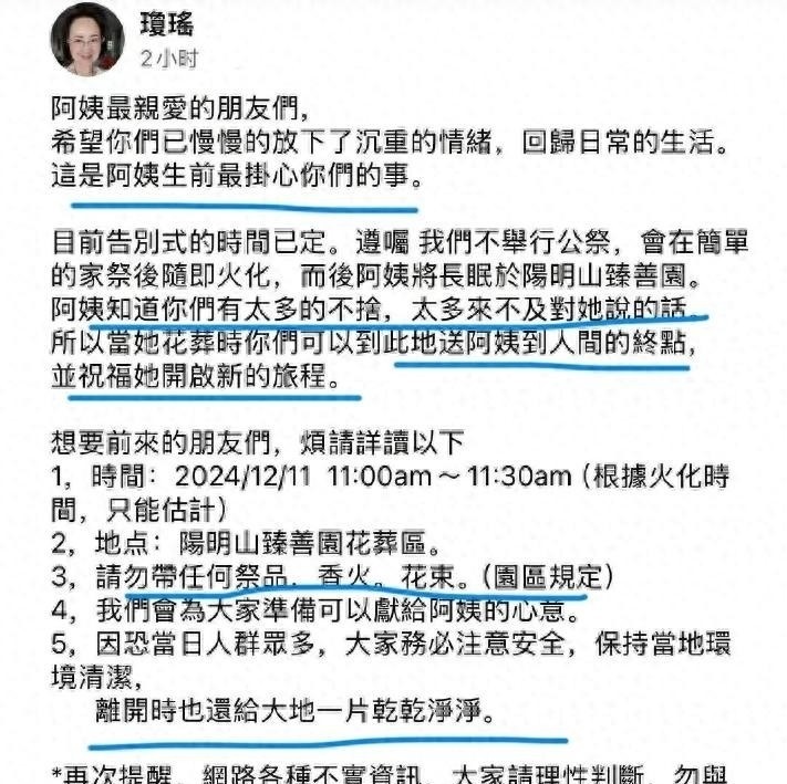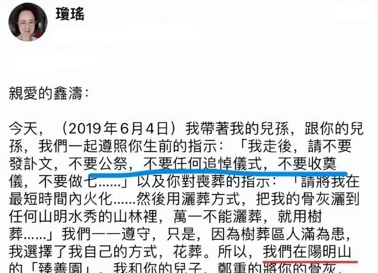 他违背了母亲的遗愿,公开举行了悼念活动,并计划将琼瑶安葬在阳明山。