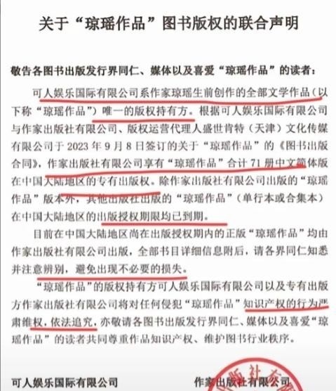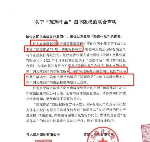 她发布声明,明确可人娱乐是琼瑶作品的唯一出版方,并对任何侵权行为采取法律手段。