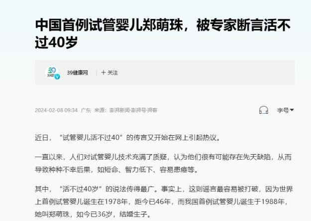 信息来源:澎湃新闻 2024-2-8 中国首例试管婴儿郑萌珠,被专家断言活不过40岁