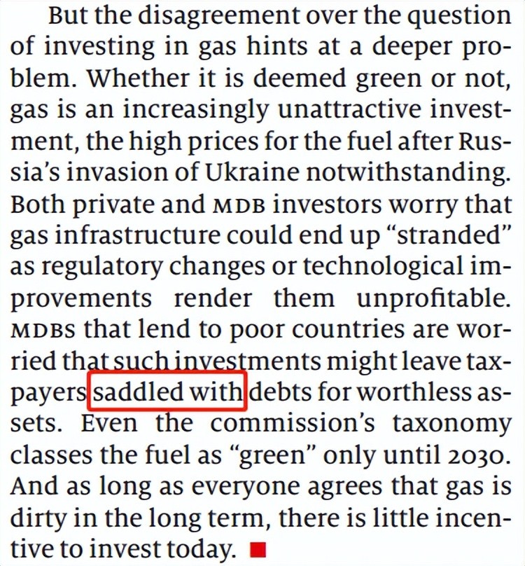 但是在投资天然气问题上的分歧暗示了一个更深层次的问题。不管天然气是否被认为是环保,尽管俄罗斯入侵乌克兰后燃料价格居高不下,天然气都是越来越没有吸引力的投资。私人投资者和多边开发银行(MDB)投资者都担心,随着监管变化或技术进步使天然气基础设施无利可图,它们可能会“搁浅”。贷款给贫穷国家的多边发展银行(MDBS)担心这样的投资可能会让纳税人背负无价值资产的债务。在2030年之前,委员会的分类甚至也只是将这种燃料归类为“绿色”。从长远来看,只要每个人都认为天然气对空气有污染,那么今天就没有什么投资的动力。